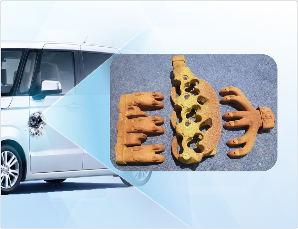 砂型のバリ取りを効率化するため、中子のバリ取りに特化した工具を独自開発しました。刃形状と表面特殊加工により耐摩耗性を高めており、特許も取得しています。工具のサイズについては、お客さまのご要望に応じて製作が可能です。また、使用済みの砂を産業廃棄物にせず再利用する新たな技術開発にも着手し、環境負荷の低減にも取り組んでおります。