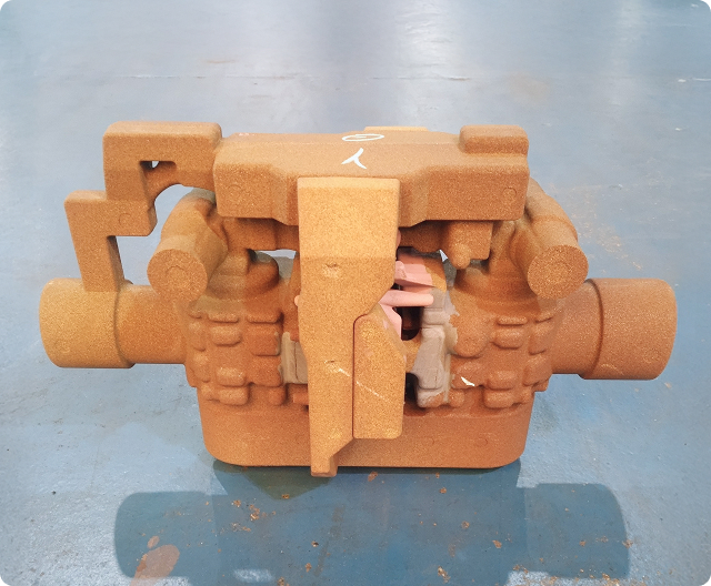 珪砂とアルカリフェノール樹脂を混練した砂で造形した鋳型を、炭酸ガスによって硬化させる、古くから広く使用されてきた工法です。製造に金型が不要なため、製作コストを抑えられるメリットがあります。船舶部品や特殊な建設機械部品など、小ロット品や大型品、高精度を求められる製品の製造に用いられることが多い工法です。