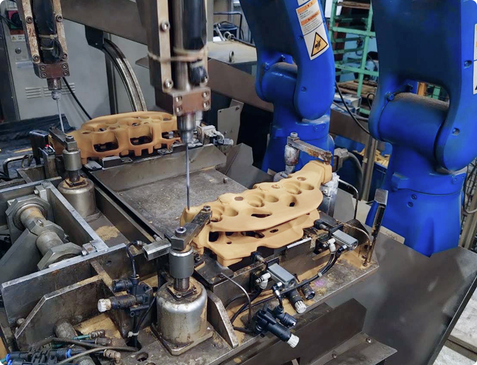 高品質の中子を作るためには、精度の高い型が不可欠です。当社では、シェルモールド法で使用する金型の設計・製作を自社にて行っています。また、鋳造現場で使用されるバリ取り用ロボットに鋳造品をセットする受け台をはじめ、各種治具の製作も行っております。鋳造を知り尽くしているからこそできる、作業効率と耐久性を考慮した金型や治具の設計・製作が可能です。